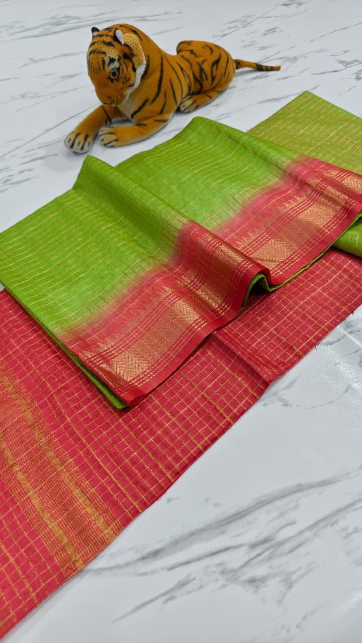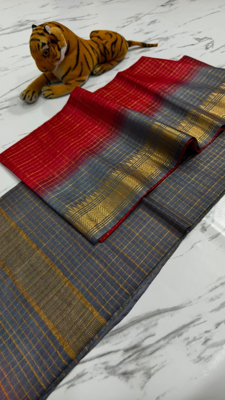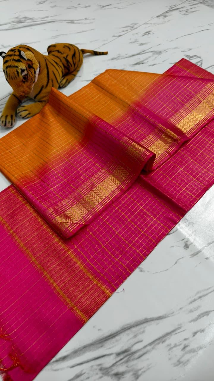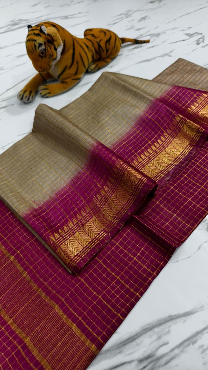 Discover timeless elegance with our premium Mangalagiri Silk Saree, crafted with a rich copper zari temple border and a beautiful full-check body design. Made using soft-quality silk, this saree offers a luxurious drape and a refined traditional look.